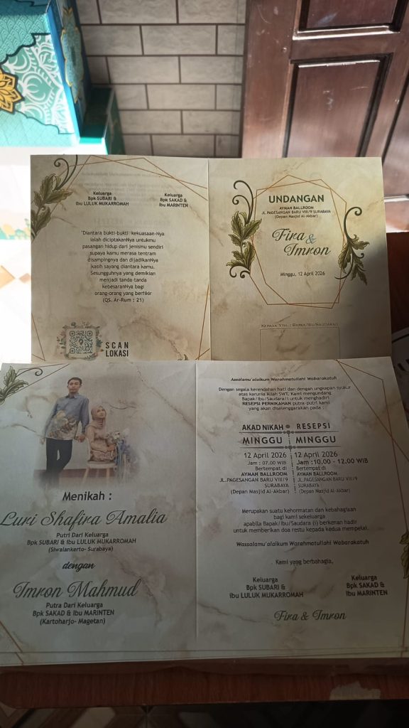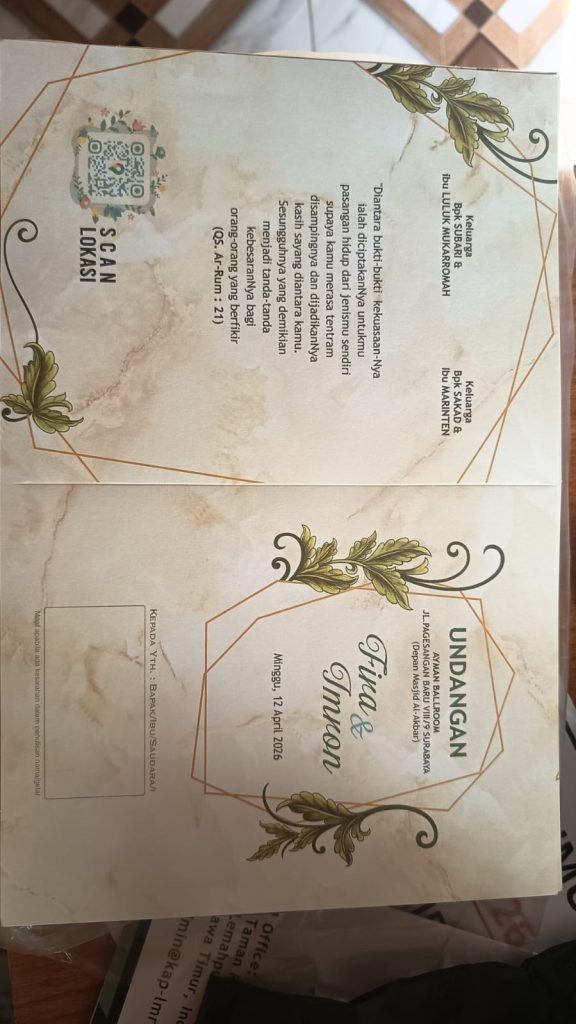 Bisa langsung hubungi kami di http://bit.ly/mutiaranew atau datang lansung ke tempat kami Jl. Tenggilis Lama IV A No. 18 kec. Tenggilis Mejoyo Surabaya. Banyak contoh undangan ditempat kami silahkan datang langsung yaa….